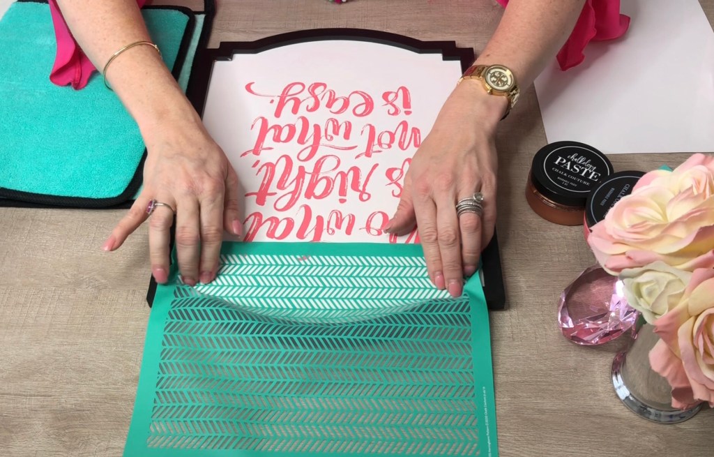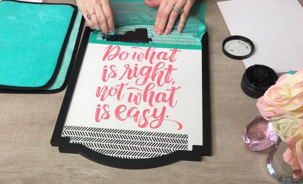 I wanted to add some extra pizzazz to the top and bottom so I looked at pattern transfers and landed on the Herringbone Pattern Transfer but really there are so many options that I could have chosen. I used classic Black Velvet paste for this accent.